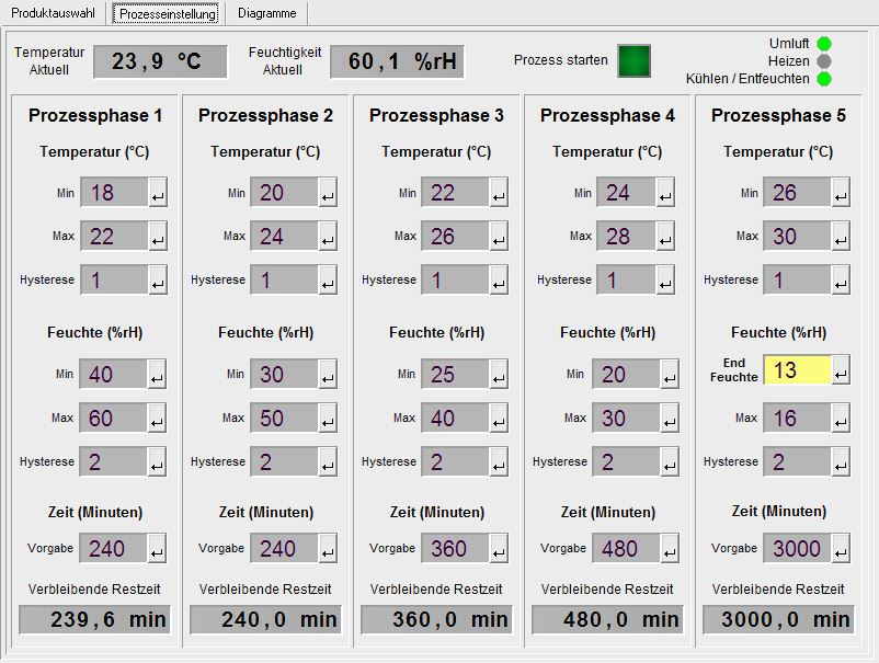 Sonderausführung mit Prozess-Controller: In den Standard-Dörrschrank wird von uns ein 8'' Touch-PC eingebaut. Damit lassen sich für beliebig viele Produkte die Dörrprozesse individuell kontrollieren. Mit dem Prozess-Controller lässt sich der Dörrablauf in Abhängigkeit von Zeit, Temperatur und Feuchte steuern. Dies ist besonders für das Trocknen von Nudeln, Salami usw. zu empfehlen. Die Prozesse sind über den Touchsreen-Monitor einfach zu programmieren und zu bedienen. Diese Ausführung des Trockners wurde von uns entwickelt und ist nur bei uns erhältlich!!